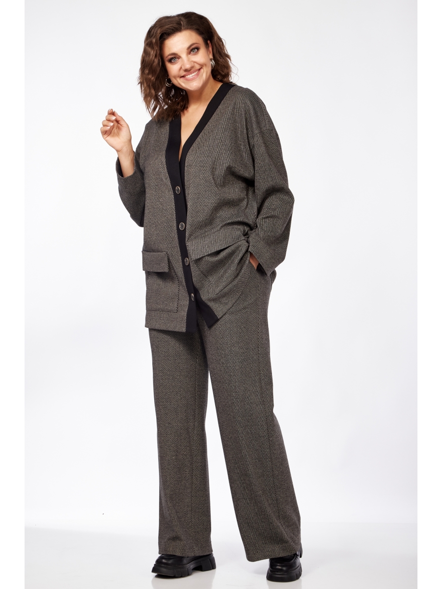 Стильный женский костюм, состоящий из кардигана и брюк. Выполнен из трикотажного полотна (тянется). Кардиган свободного кроя с центральной застежкой - планкой на пришивные пуговицы. Рукав слегка спущен. По переду накладные карманы с клапаном.