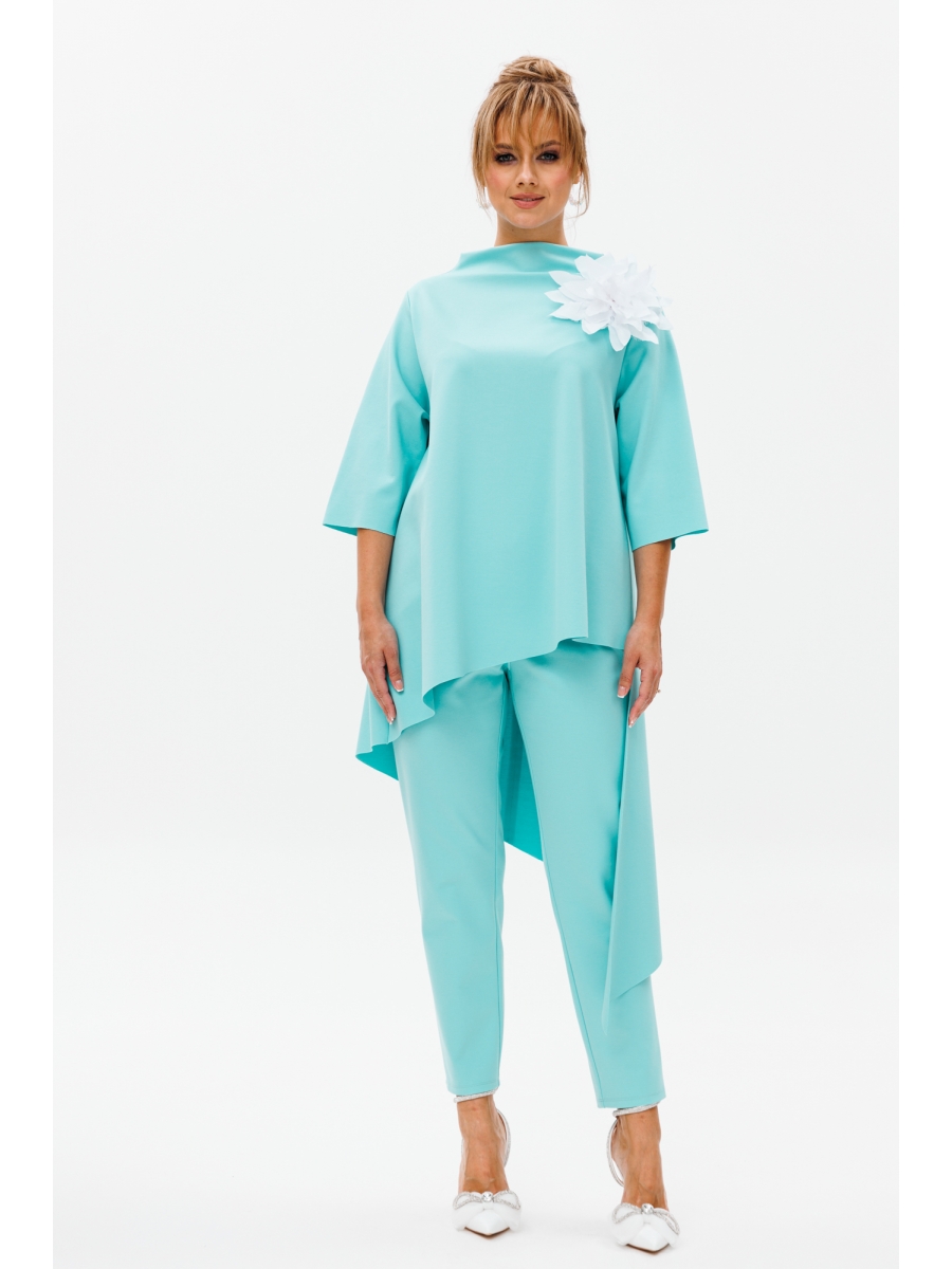 Стильный женский костюм, состоящий из блузона и брюк, выполненных из трикотажного полотна с легким ненавязчивым блеском (тянется). Изюминка данной модели – съемный декор-цветок.