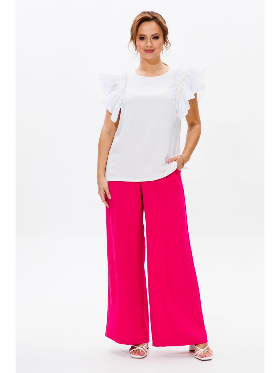 Летний женский костюм, состоящий из брюк и нарядной блузы, выполненный из костюмно-блузочной ткани (тянется).