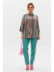 Блуза свободного силуэта, выполненная из легкой струящейся ткани (не тянется) с модным принтом. По переду центральная застежка на петли-пуговицы. По спинке отрезная кокетка, от которой заложена складка для свободы движения. В нижней части спинки горизонтальный подрез с разрезом по середине. Низ блузы фигурной формы. Горловина оформлена рубашечным воротником со стойкой. Рукав втачной, одношовный, длиной ¾.