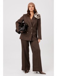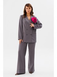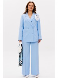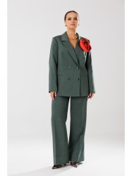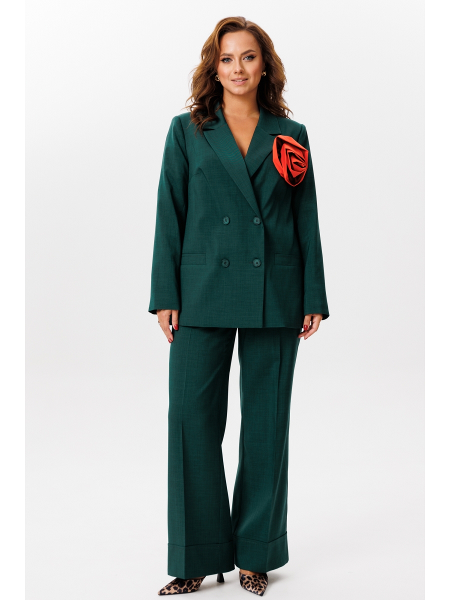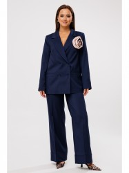 Жакет прямого кроя на подкладке. По переду нагрудные вытачки, функциональные карманы с листочкой, центральная двубортная застежка на петли-пуговицы. Горловина оформлена воротником пиджачного типа с лацканом. Спинка со средним швом, шлицей-планкой из отделочной ткани, застегивающейся на петли-пуговицы. Рукава втачные, двухшовные. Жакет декорирван съемным цветком из отделочной ткани.