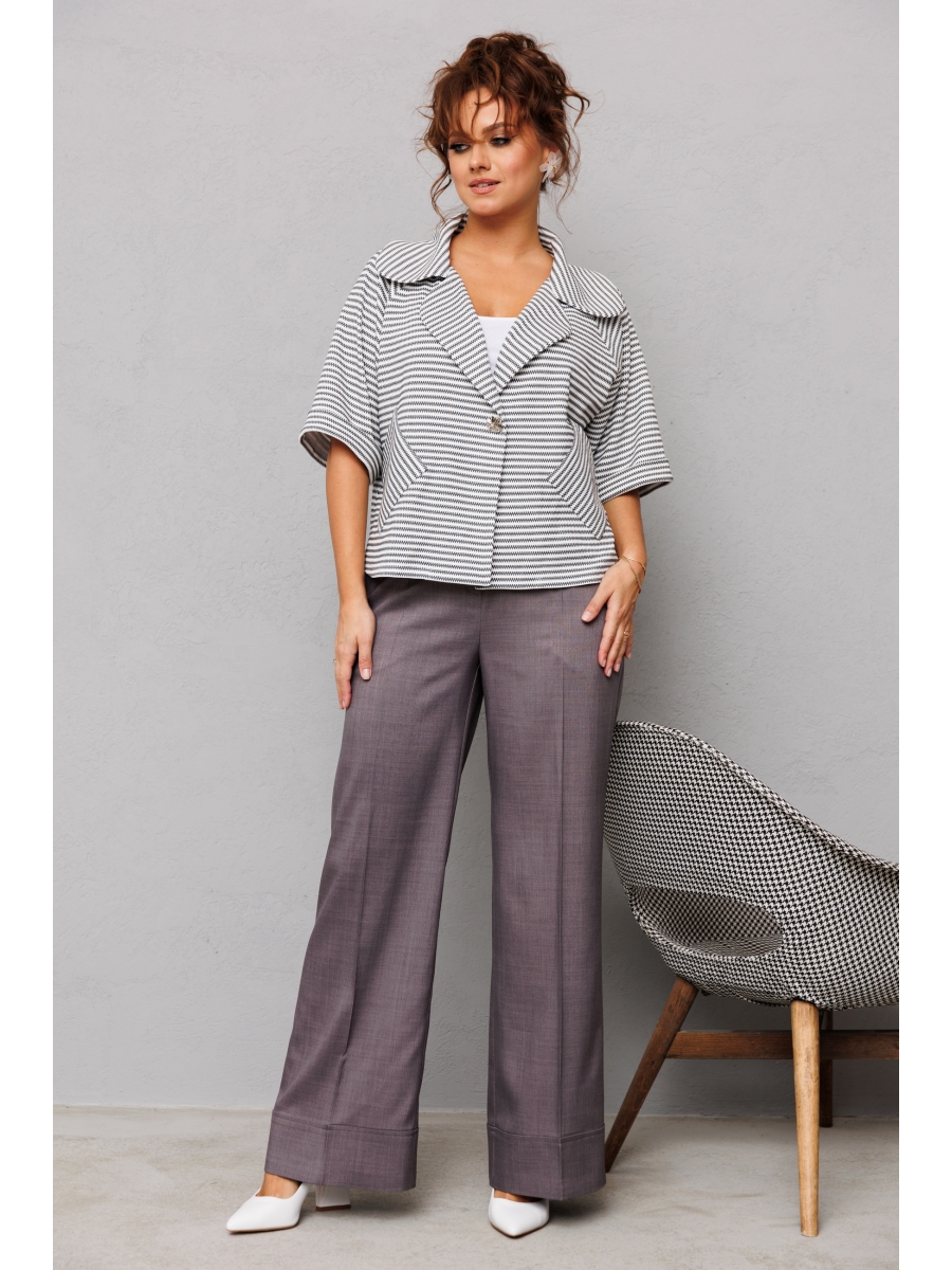 Брюки прямого кроя с высокой посадкой, с наклонными карманами в боковых швах, по срезу банта – застежка-молния. По передним половинкам талиевые вытачки. По низу брюк отложные манжеты. Верхний срез оформлен поясом с эластичной резинкой по задней половинке.