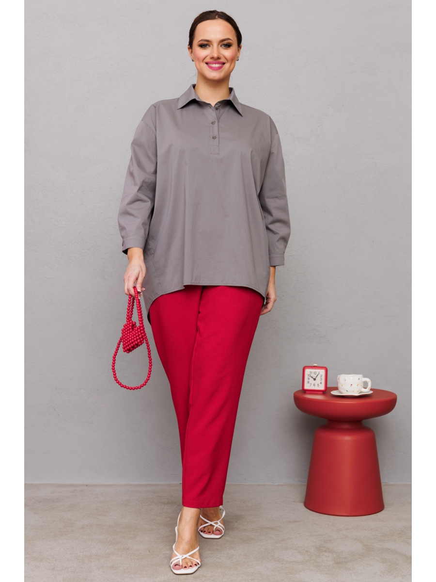 Блуза свободного силуэта «Оверсайз», выполненная из хлопковой блузочной ткани (тянется). По переду центральная застежка на петли-пуговицы. По спинке отрезная кокетка, планка на петли-пуговицы, перекрытая сложной складкой крест-накрест. Низ блузы фигурной формы, разноуровневый по длине. Горловина оформлена рубашечным воротником со стойкой. Рукав втачной, одношовный длиной 7/8, по низу с притачной манжетой, застегивающейся на пуговицу.