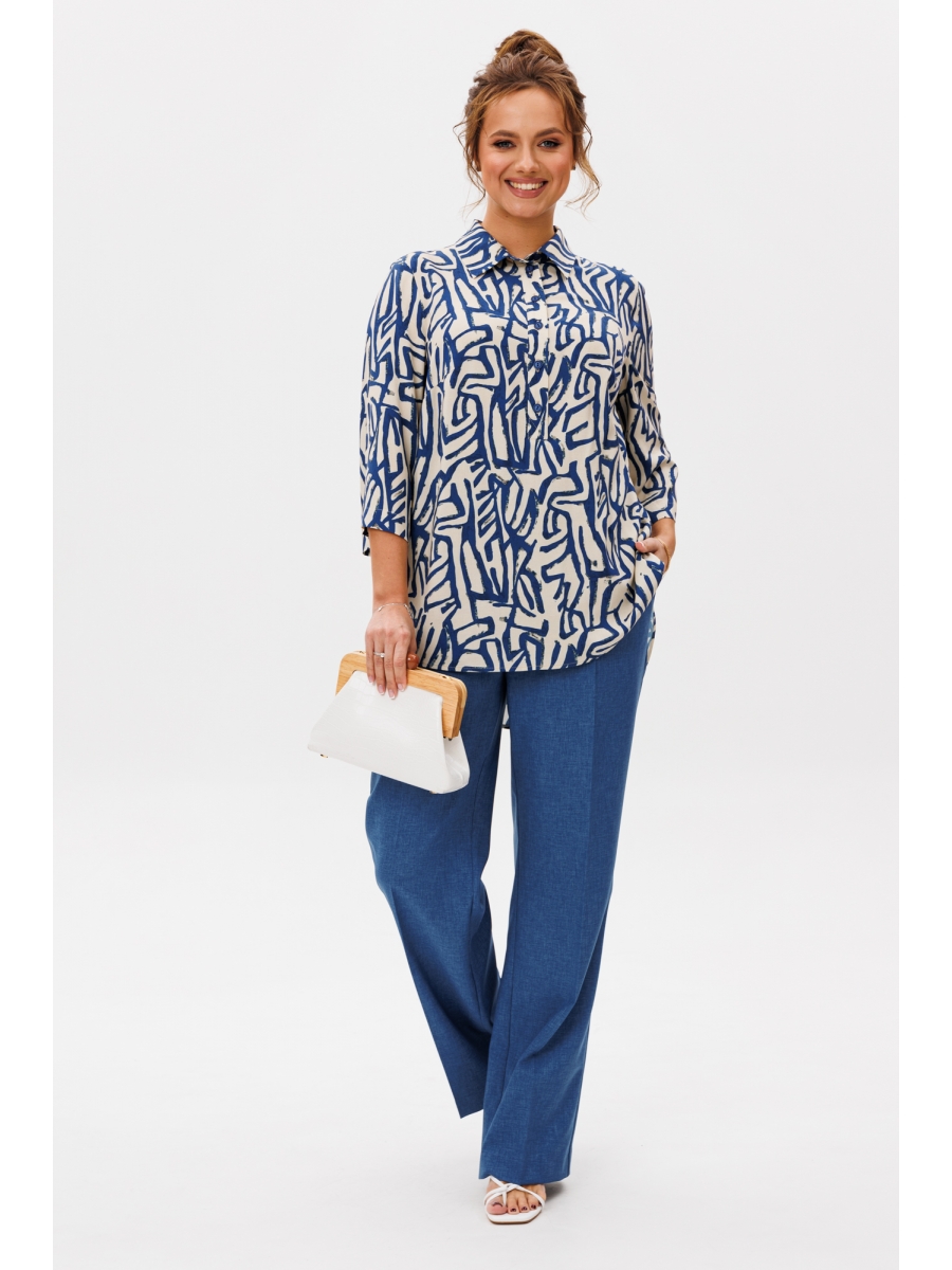 Блуза свободного силуэта, выполненная из легкой струящейся ткани (не тянется) с модным принтом. По переду центральная застежка на петли-пуговицы. По спинке отрезная кокетка, от которой заложена складка для свободы движения. В нижней части спинки горизонтальный подрез с разрезом по середине. Низ блузы фигурной формы. Горловина оформлена рубашечным воротником со стойкой. Рукав втачной, одношовный, длиной ¾.