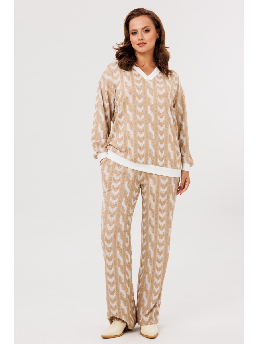 Стильный женский костюм, состоящий из джемпера и брюк.