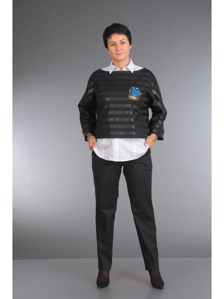 Брюки из стрейчевой текстильной ткани. Свитер декорирован карманом.