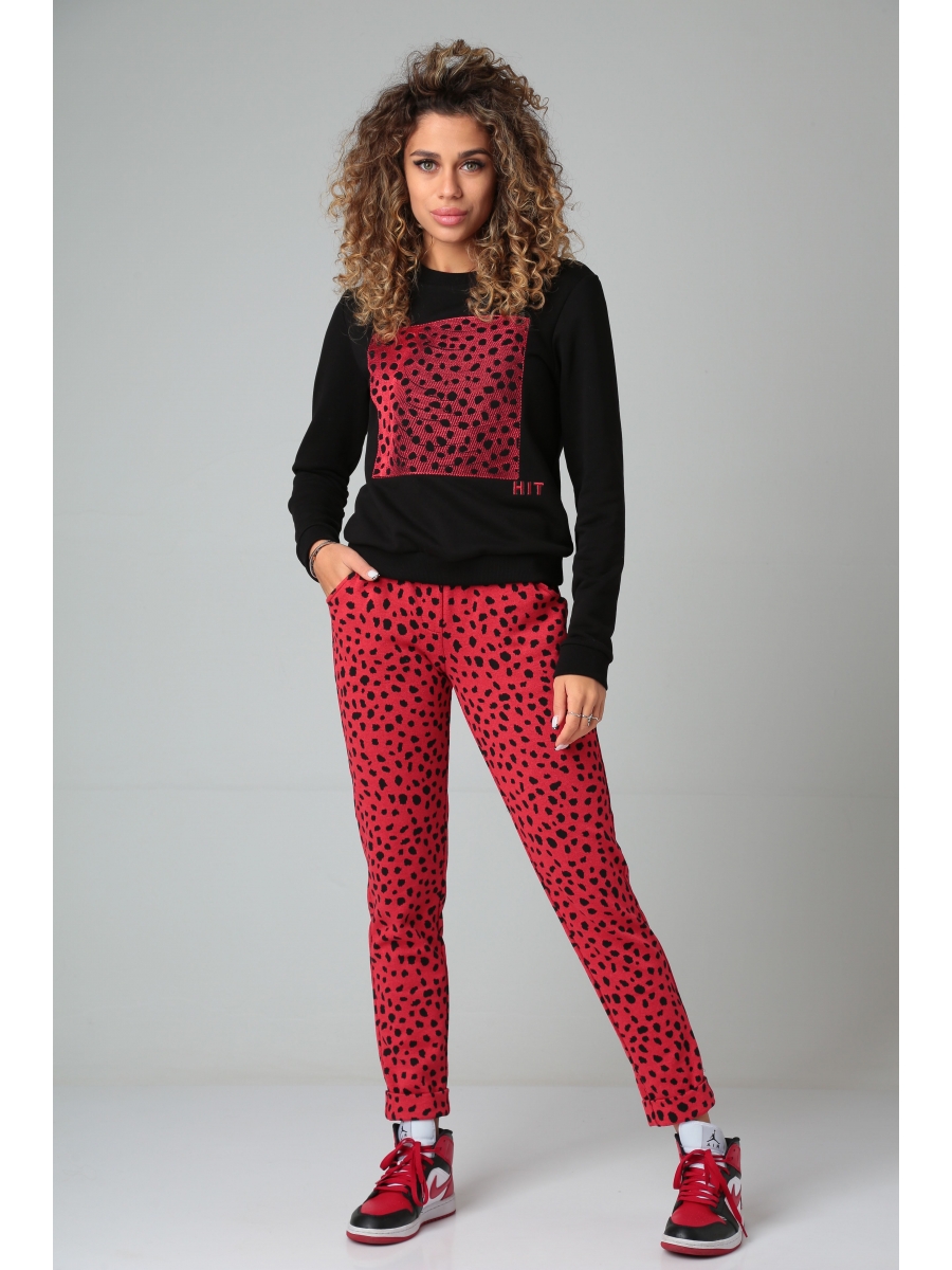 Стильный женский костюм выполнен из мягкого футера 3-ех нитка и трикотажа. Брюки зауженные к низу с отложной манжетой, пояс на резинке, с боковыми карманами и имитацией гульфика. Свитшот полуприлегающий с длинным рукавом и украшен по переду вышивкой в стиль брюк. Манжеты и горловина на трикотажном довязе-кашкорсе чёрного цвета. Костюм будет отлично сочетаться с разной по стилю обувью.