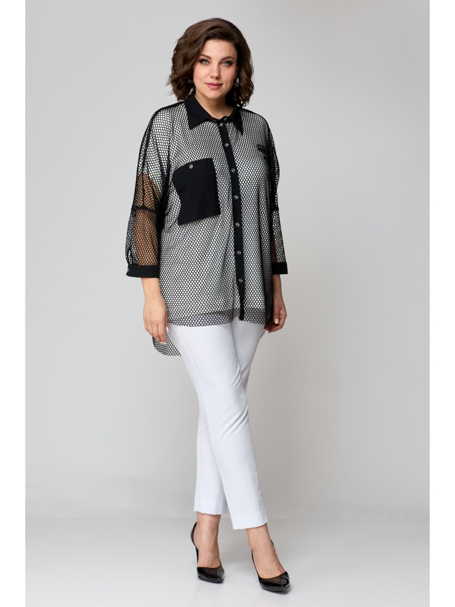 Блузка выполнена из сетки черного цвета. Блузка удлиненная, свободного кроя. Передняя часть блузы (полочка) свободного кроя без талиевых вытачек с накладным карманом. Застежка-планка с прорезными петлями на пуговицах. Спинка свободного кроя без талиевых вытачек. По центру спинки кокетка. Воротник рубашечного типа на стойке. Низ изделия с фигурными вырезами по боковому шву.