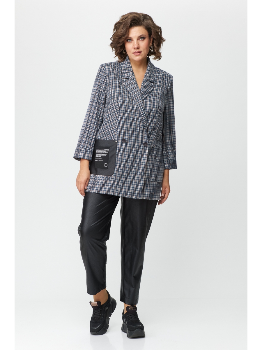 Жакет с двубортной застежкой на две петли пуговицы с воротником пиджачного типа на подкладке, на полочках обработаны боковые прорезные карманы в рамку и накладные. Рукав втачной 7/8 с притачной манжетой.