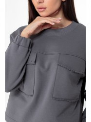 На передней части выполнена отрезная кокетка, в шве обработаны накладные карманы с клапанами. Низ свитшота на кулиске, ширину можно регулировать по вашему желанию.