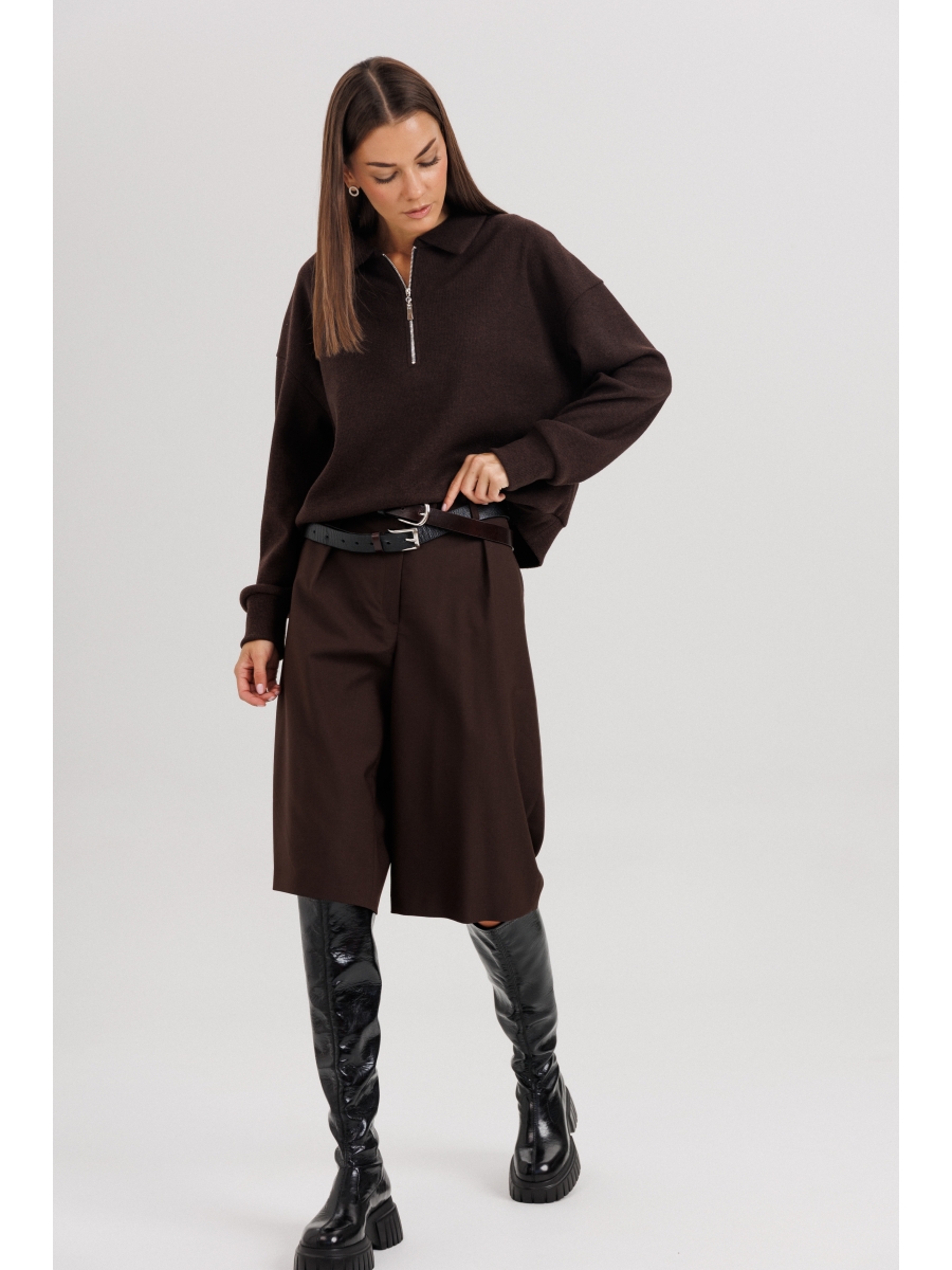 Джемпер из трикотажа. Это одна из базовых вещей осенне-зимнего сезона. Он тёплый, удобный и невероятно комфортный. К тому же, настолько универсален, что его можно стилизовать абсолютно разными способами. Свободный покрой с заниженной линией плеча, рукав рубашечного покроя на отрезной манжете, воротник классический, по центру полочки частичная застёжка-молния. По низу джемпера - отрезной пояс.
