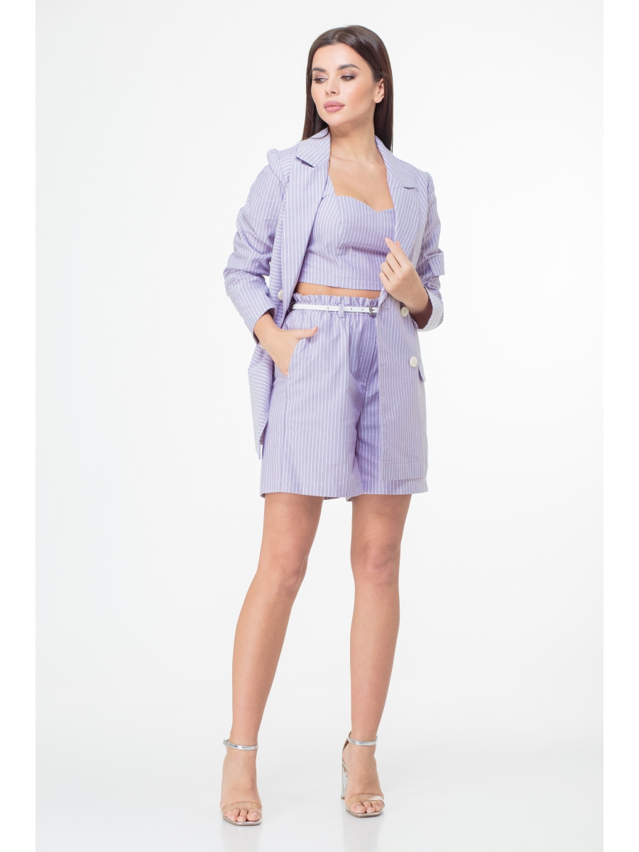 Жакет прямого силуэта, двубортный с отложным воротником и лацканами. По переду функциональные карманы с клапанами. В тачные рукава с декоративным клапаном. Спинка со средним швом. Геометрически разное направление полоски в половинках переда придаёт жакету особенность.