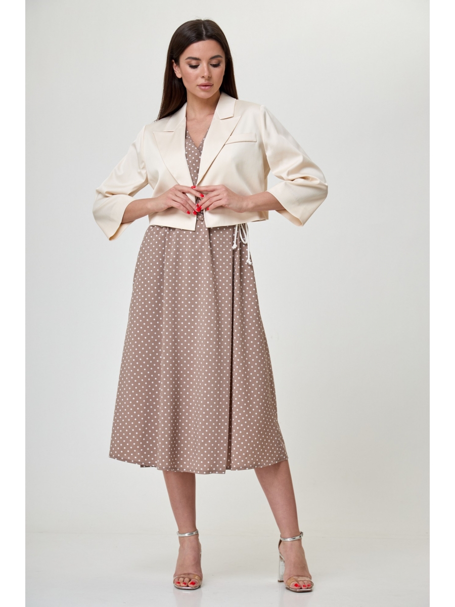 Костюм, состоящий из платья и жакета-болеро. Платье на запах, длина ниже колен. Пройма и горловина обработаны обтачками. По линии талии кулиска, в которую протянут шнурок, для фиксации платья. Так же для этого можно использовать узкий пояс.