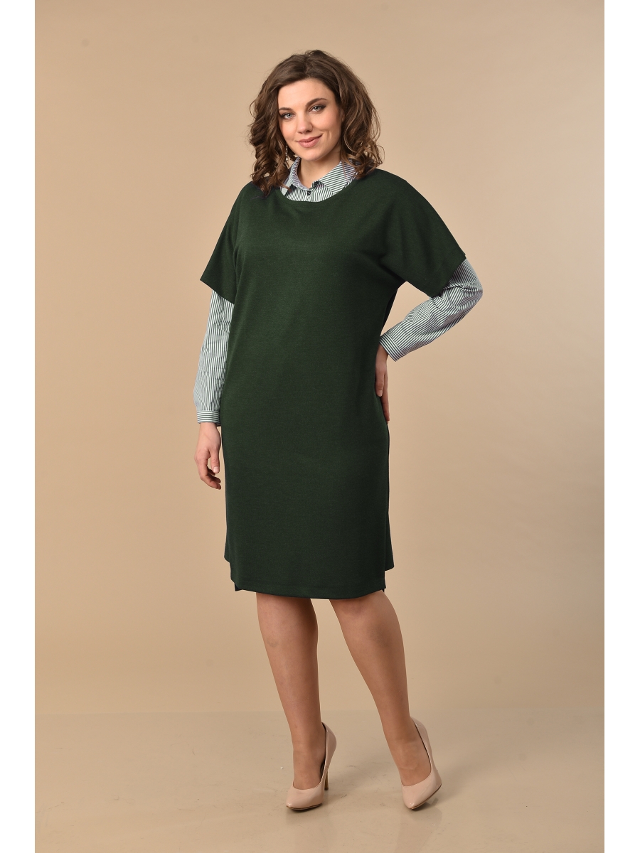 Платье прямого силуэта с круглым вырезом горловины, обработанной отрезной деталью. Спинка со средним швом. Спинка длиннее переда. Внизу боковых швов вставлена отрезная деталь из отделочной ткани. Рукава цельнокроеные, короткие.