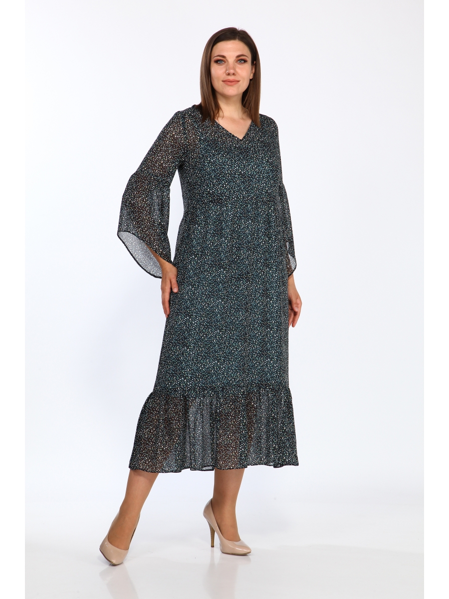 Платье женское, А - силуэта, из шифона, длинное. С V -образным вырезом горловины, обработанным окантовкой. Платье отрезное по линии талии, с нагрудными вытачками. Верхняя часть спинки цельная с каплевидным разрезом с завязками из окантовки. Переднее полотнище юбки цельное, заднее из 2-ух частей. По низу юбки широкая отделочная деталь со сборкой вверху. Рукава втачные, одношовные, длинные. По низу рукавов отделочная деталь фигурной формы со сборкой по шву притачивания к рукаву.