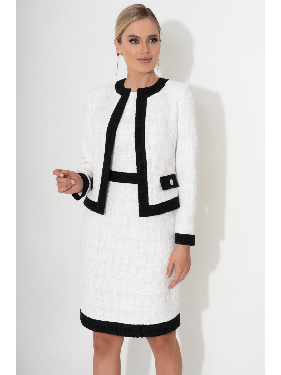 Костюм женский из костюмной фактурной ткани с отделочными деталями контрастного цвета, состоит из жакета без застежки и платья с коротким рукавом.