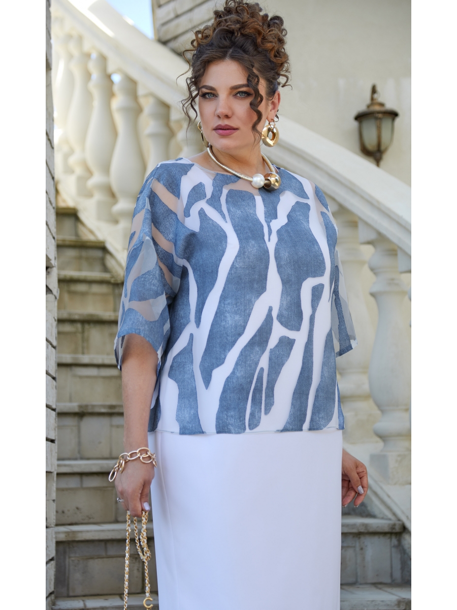 Невероятно стильный комплект с фактурным рисунком «под джинс», легкий, летящий, буквально невесомый силуэт подчеркнет красоту вашей фигуры и скроет недостатки. Сочетание яркой блузки со светлым платьем придают образу особую изюминку. Идеальный вариант на торжественное мероприятие, а платье можно носить и в повседневной жизни, дополнив его аксессуарами!