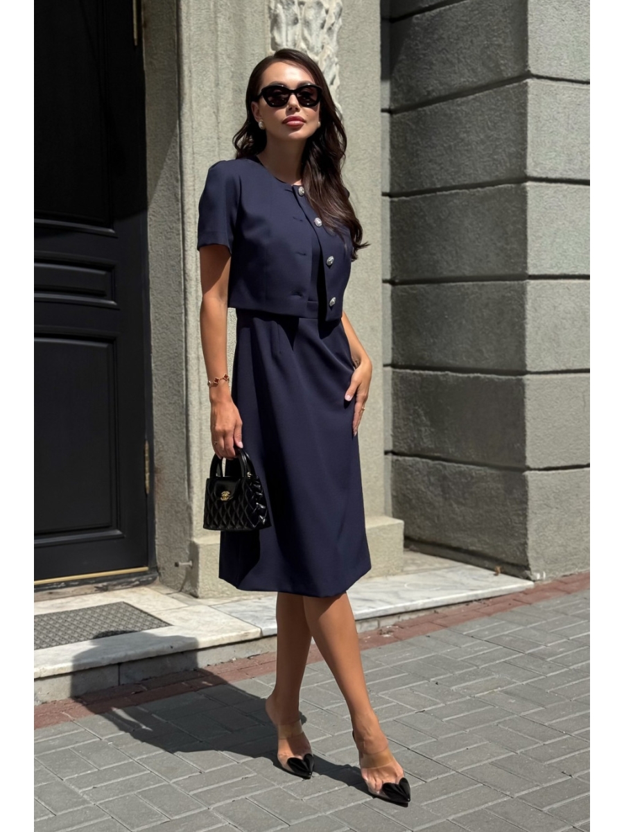 Элегантный женский костюм с платьем тёмно-синий — универсальное решение для офиса, торжественных мероприятий, свадьбы или деловых встреч. Этот классический костюм двойка состоит из изысканного платья без рукавов и укороченного жакета с декоративными пуговицами. Приталенный силуэт подчёркивает фигуру и создаёт стильный образ для любого случая.