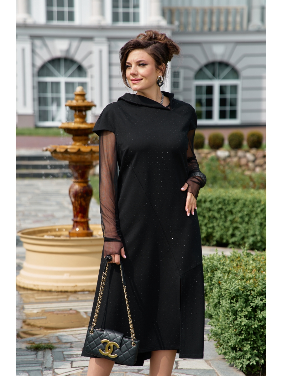 Глубокий матовый чёрный трикотаж мягко струится, переливаясь при движении мелкими искорками страз.