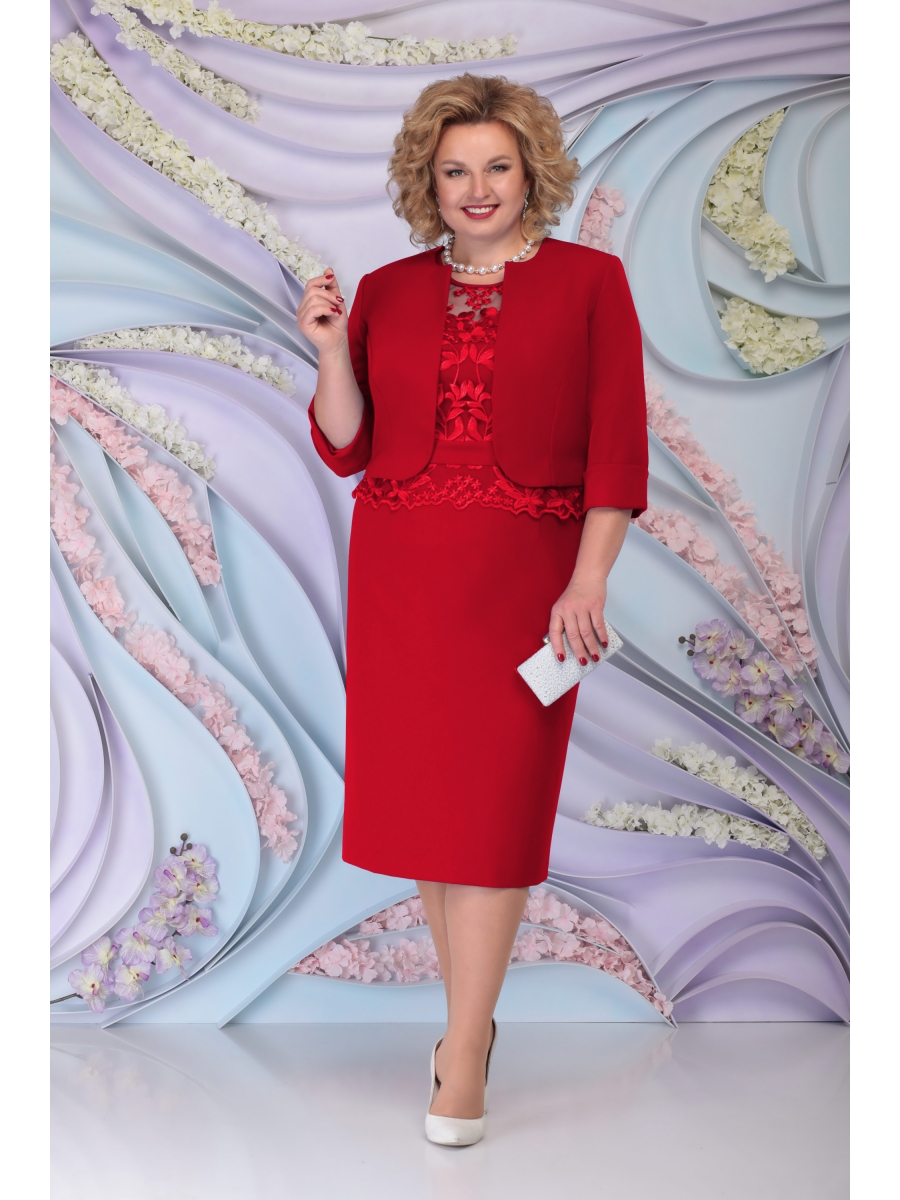 Платье женское, полуприлегающего силуэта, с отрезным поясом по линии талии, чуть зауженное к низу. Длина по среднему шву спинки 109,0 см. Нижняя часть лифа с обрезанной плечевой частью, с обтачным вырезом декольте. В шов обтачивания декольте вставлены обтачные бретели, шириной 3,0 см частью. Верхняя часть двойная, нижняя часть из основной ткани, верхняя из гипюра. Нагрудные выточки выходят из проймы. На нижней части спинки талевые выточки. Юбка с выточками, на подкладке из дышащей, приятной на ощупь и достаточно эластичной ткани с баской из гипюра. Рукава втачные, одношовные, длиной 28,0 см. Горловина круглая, углублённая, окантованная. В среднем шве спинки обработана застёжка на потайную тесьму молнию и шлица.