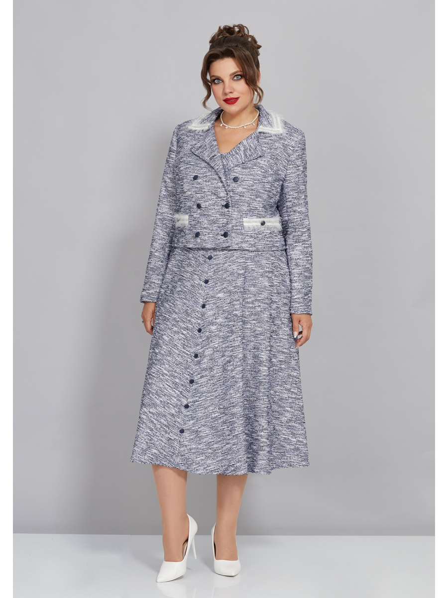 Пиджак двух-бортный, на подкладке, выполнен из трикотажа, декорирован тесьмой. Застежка пиджака двух-бортная, горловина обработана воротником, также на переднем полотнище обработаны листочки и декорированы пуговицами. Рукав пиджака втачной, длинный, спинка со средним швом.
