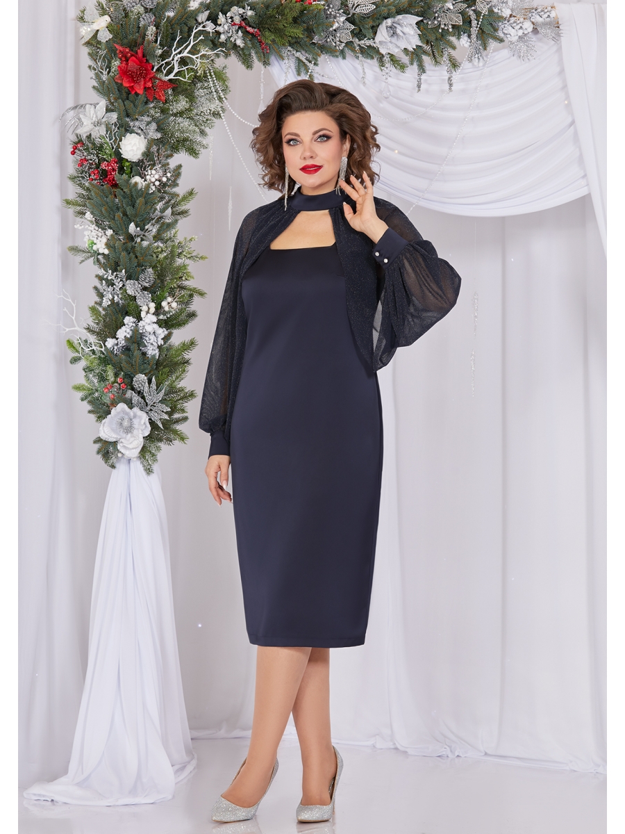 Платье выполнено из атласа высокого качества, на трикотажной подкладке. Горловина платья квадратной формы, обтачена подкладкой. На полочке обработаны нагрудные вытачки, пройма также обтачена подкладкой. Спинка со средним швом и вытачками, в среднем шве потайная молния, по низу разрез.