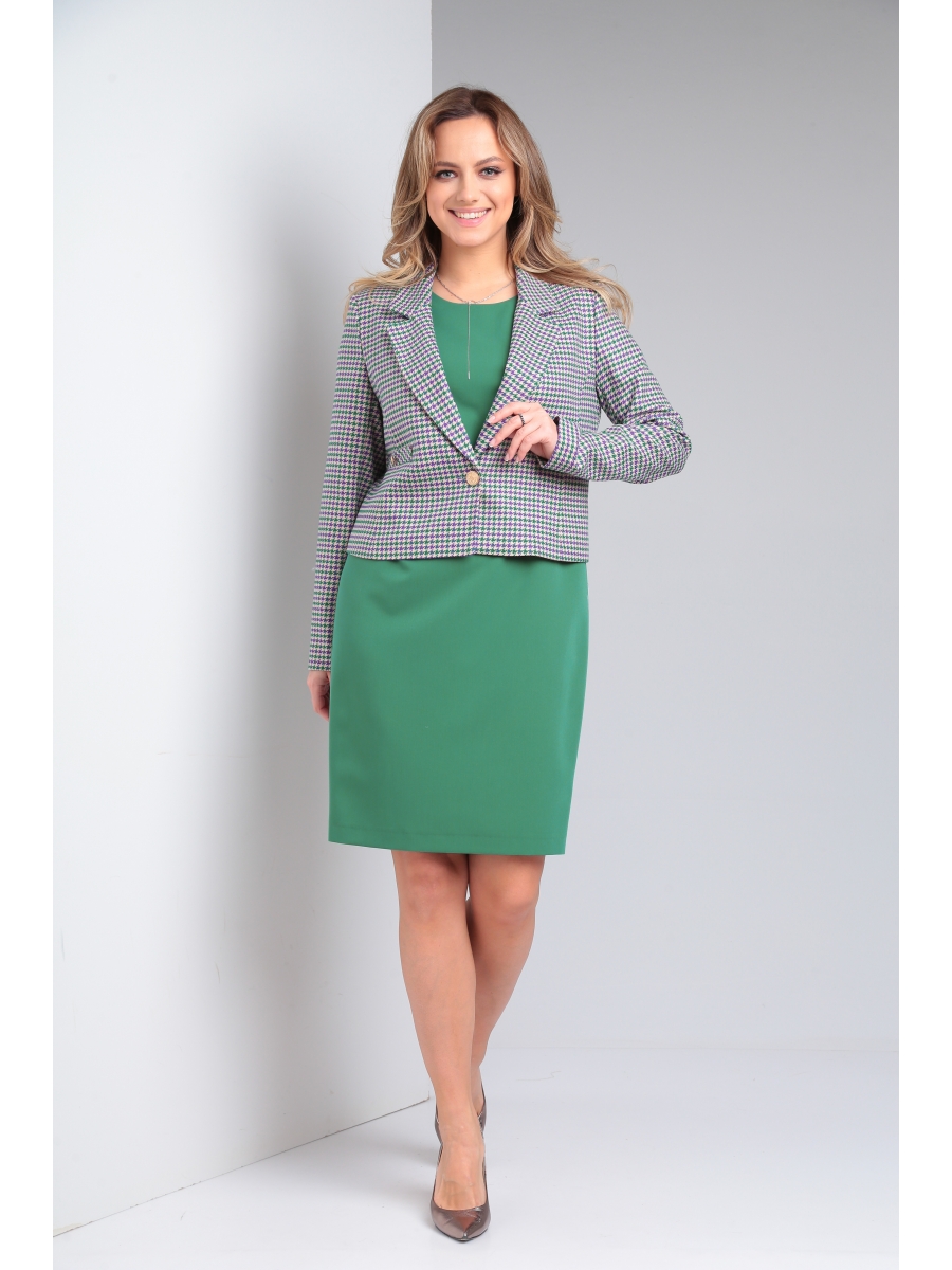 Жакет полуприлегающий укороченный, перед и спинка на подкладке. По переду центральная застежка. Воротник пиджачного пипа с отложными лацканами. Функциональные карманы с листочкой. По спинке средний шов. Рукав втачной двухшовный длинный.