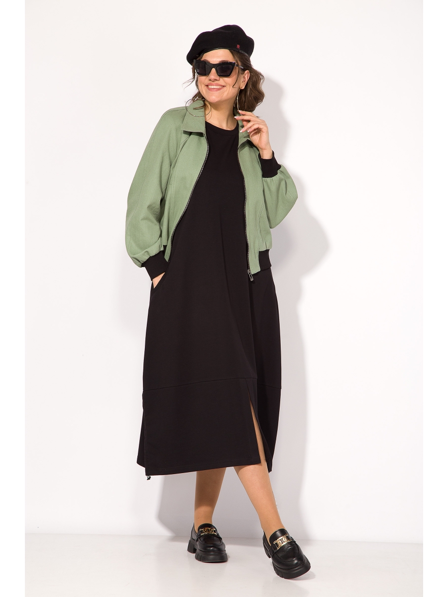 Эффектный женский комплект, состоящий из джинсового бомбера и трикотажного платья в стиле «спорт-шик».