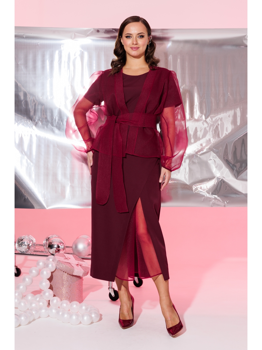 Платье полуприлегающего силуэта, выполненное из костюмно-плательной ткани (тянется). По переду нагрудные и талиевые вытачки, ассиметричный подрез, переходящий в разрез, который декорирован воланом из органзы. По лифу переда – трикотажная подкладка. По спинке средний шов и талиевые вытачки. Застежка в среднем шве спинки на потайную тесьму-молнию. Рукава втачные, одношовные.