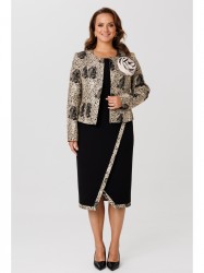 Жакет полуприлегающего силуэта, выполнен из костюмной ткани (однотон тянется, дизайн – не тянется), на подкладке. По переду рельефные швы, застежка встык, горловина округлой формы. По спинке средний шов и талиевые вытачки. Рукава втачные, двухшовные. Жакет декорирован съемным цветком из отделочной ткани. Жакет с плечевыми накладками.