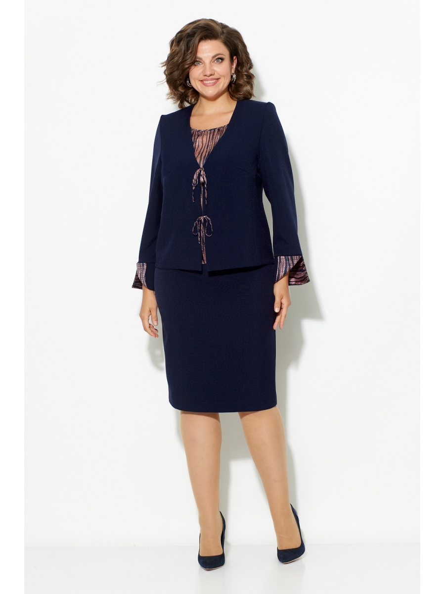 Жакет и юбка из костюмной ткани с добавлением вискозы. Жакет укороченный, полуприлегающего силуэта с V-образным вырезом горловины. Застежка на две навесные петли с пуговицами и декоративными завязками из отделочной ткани. Рукав длинный. По низу рукава отворачивающийся манжет с разрезом, нижняя часть манжета из отделочной ткани.