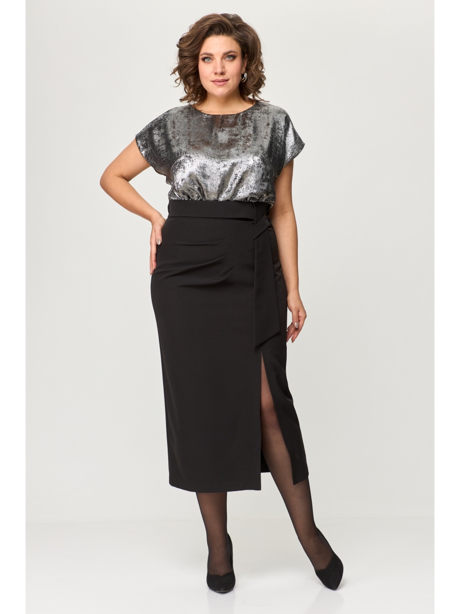 Блузка выполнена из однотонной ткани с эффектом блеска. Юбка выполнена из однотонной ткани, юбка на подкладке. Блузка свободного силуэта. Полочка блузки с нагрудными вытачками. Горловина круглой формы. Спинка цельная. Рукав цельнокроеный, короткий.