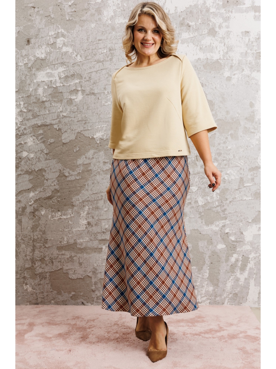 Блузка из трикотажного полотна футер прямого силуэта. По переду нагрудные вытачки с бокового шва. Горловина в форме "лодочки". Рукав одношовный, втачной, 3/4 длины.