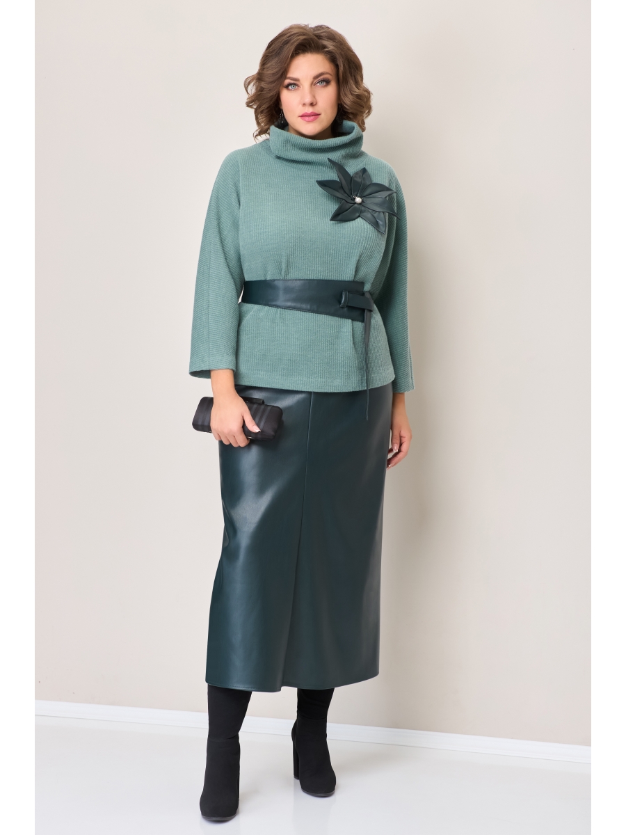 Изысканный комплект из трикотажного джемпера и юбки из искуственной кожи с утеплением.