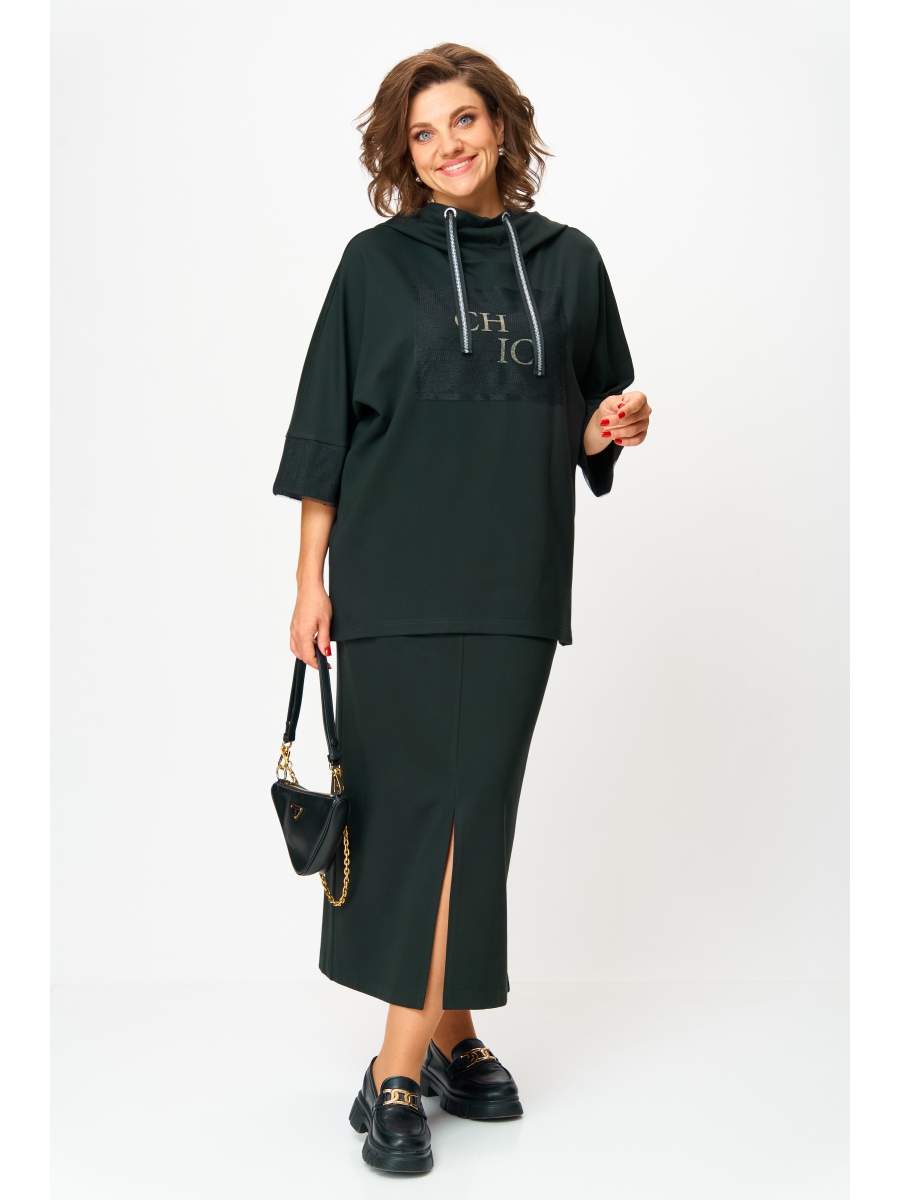 Свободное худи с капюшоном и декоративной вставкой легко вписывается в динамичный ритм жизни, а юбка миди с разрезом добавляет женственности и свободы движений.