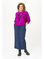 Комплект включает в себя яркий темно-синий джемпер с рукавами реглан «летучая мышь» и изящную юбку в пурпурных тонах, выполненную из мягкого, приятного к телу вельвета.