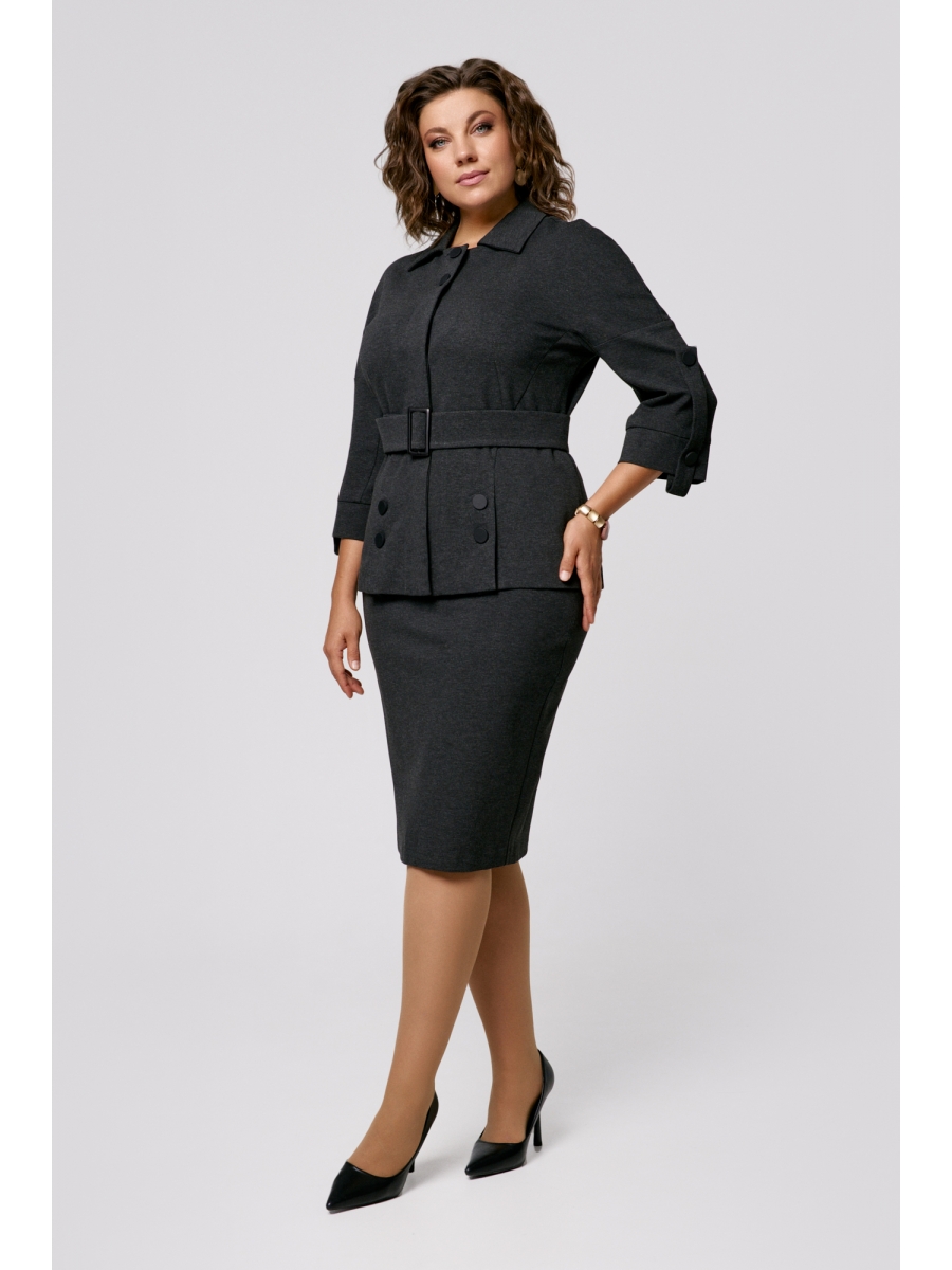 Жакет без подкладки со спущенной линией плеча и манжетами с декоративными патами; по переду декоративные шлицы, в боковых швах функциональные карманы, воротник рубашечный, застежка потайная на петли и пуговицы. В комплекте съемный пояс из основной ткани.