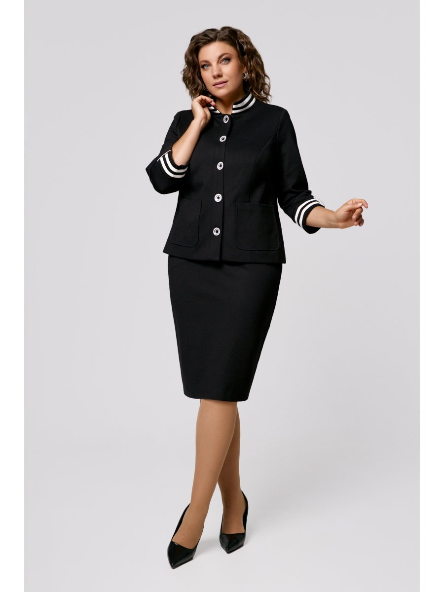Женский костюм полуприлегающего силуэта, состоящий из жакета и юбки, выполнен из высококачественного трикотажа.