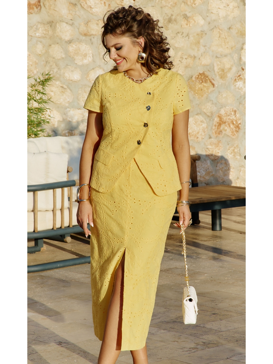 Вообразите себе изысканный женский костюм выполненный из ришелье в тёплых жёлтых оттенках, которые словно обнимаю и согревают своим солнечным светом.