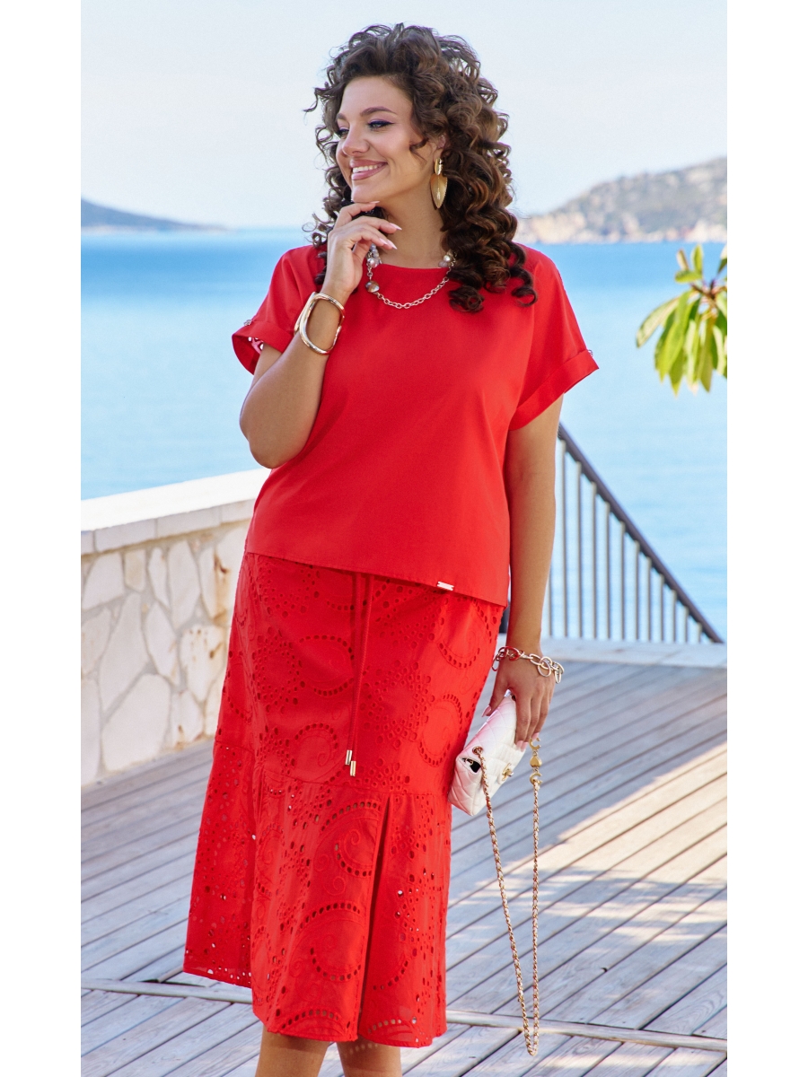Женский летний костюм из легкой однотонной ткани в сочетании с изысканным ришелье олицетворяет утонченность и свежесть.