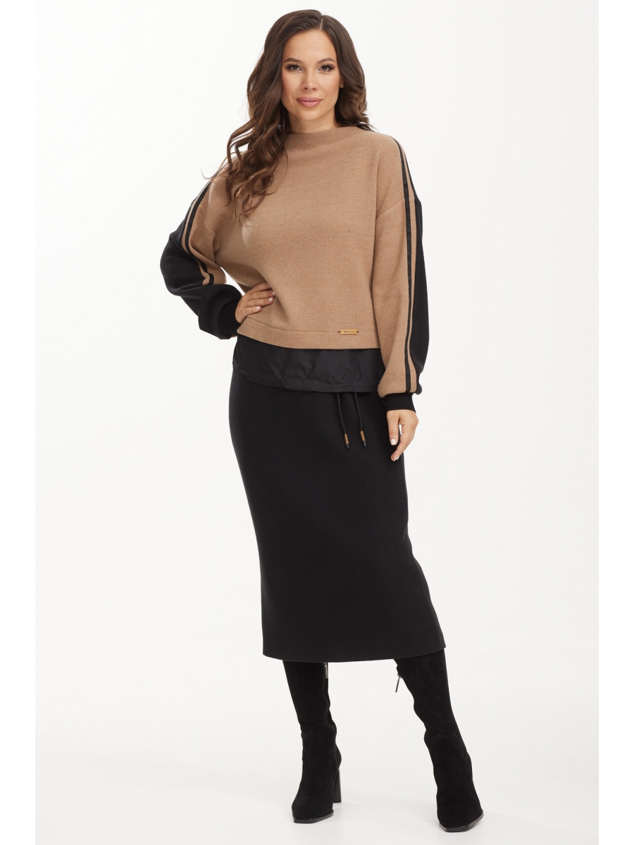 Джемпер прямого свободного кроя. Рукав втачной, слегка спущен, дополнен притачной манжетой. Горловина - стойка цельнокроеная. Перед джемпера выполнен из коричневого трикотажа, спинка - из черного. Спереди джемпер дополнен притачной планкой с кулиской по низу.