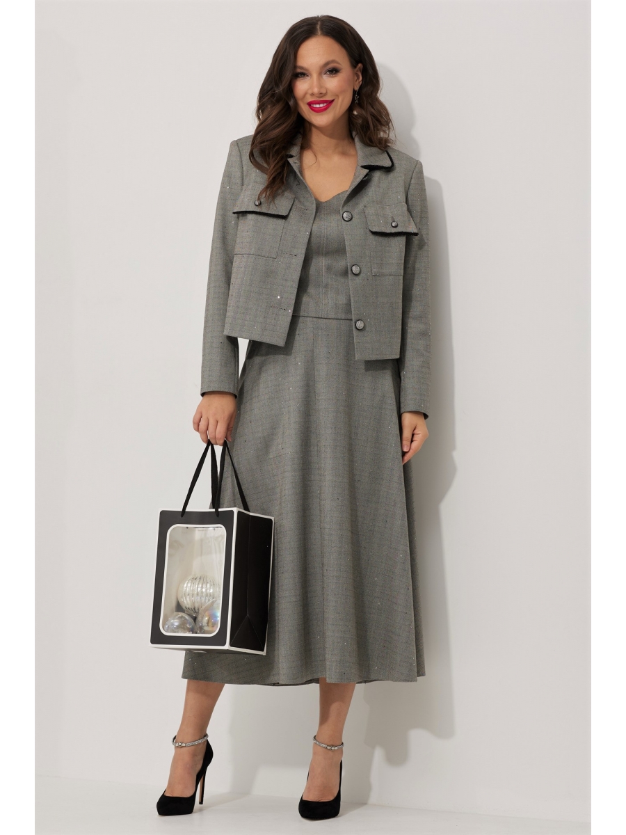 Выполнен из костюмной ткани с россыпью слегка мерцающих пайеток.