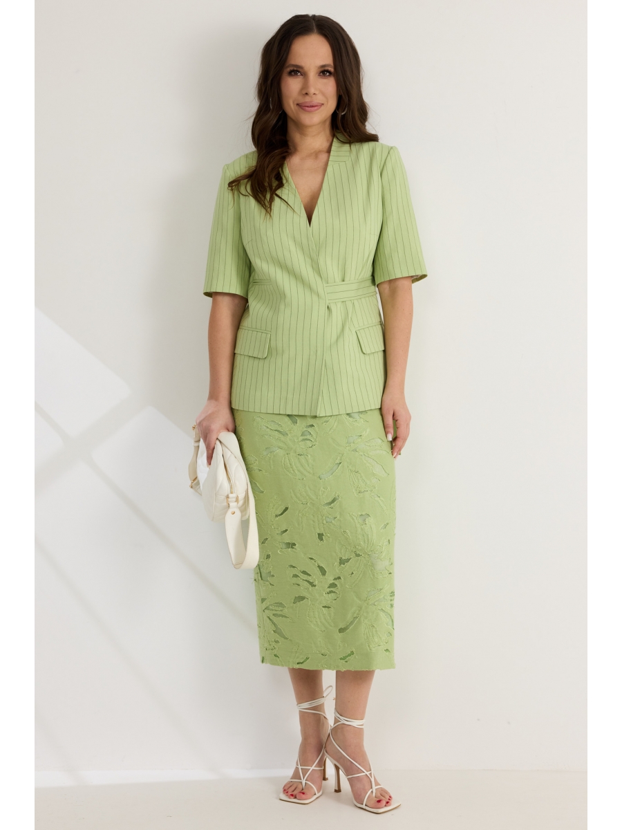 Однобортный жакет полуприлегающего силуэта, на хлопковой подкладке, с центральной застежкой на потайные кнопки. Рукав втачной. Жакет дополнен декоративным элементом в виде пояса с застежкой по боку на пуговицу, а так же функциональными карманами с клапанами. Выполнен жакет из поли вискозного полотна цвета лайм в меловую полоску.