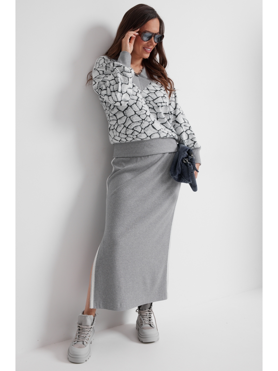 Юбка макси с одним боковым разрезом. Выполнена из приятного к телу трикотажа в рубчик. Дополнена отделкой из тесьмы по боковым швам. Юбка с притачным поясом, дополненным эластичной тесьмой.