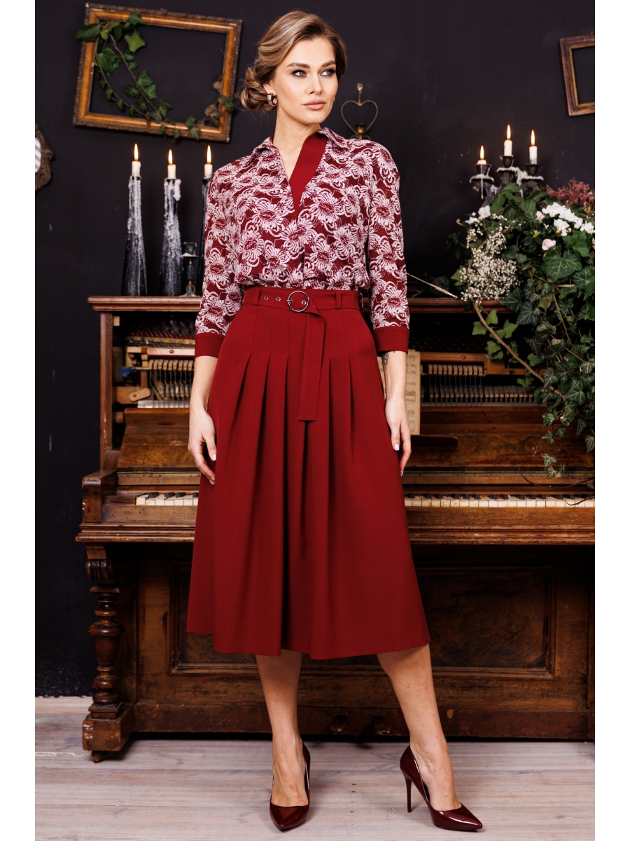 Юбка А-силуэта, по переду и спинке со складками. Верх юбки на притачном поясе. Застежка на тесьму-молнию в боковом шве.