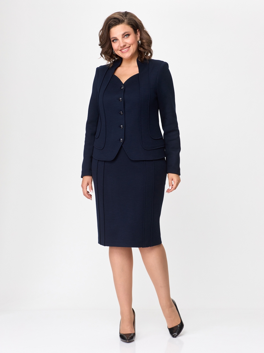 Оформить заказ →Женский повседневный костюм, состоящий из жакета и юбки. Выполнен из трикотажного полотна с шерстью (30% натуральная шерсть, 70% пан) собственного производства. Жакет полуприлегающего силуэта. Декоративные рельефы по переду жакета и юбки. Рукав втачной. По спинке средний шов, рельефы. Застежка на пуговицах. Спереди на подкладке. Юбка прямого силуэта на подкладке. В поясе, по бокам от вытачки до вытачки с эластичной лентой. На заднем полотнище юбки средний шов со шлицей и застежкой на пуговицу и молнию. Пуговицы могут отличаться от представленных на фото. Костюм хорошо подойдет для работающих в сфере образования и офисных работников. При подборе необходимого размера, используйте таблицу обмерных данных в готовом виде. Чтобы перейти в общий каталог моделей, нажмите на иконку бренда в карточке товара. Все изделия производятся в Республике Беларусь на собственной фабрике. Мы будем рады вашим отзывам и рекомендациям, благодаря им мы становимся лучше! Спасибо, что выбираете ZLATA!