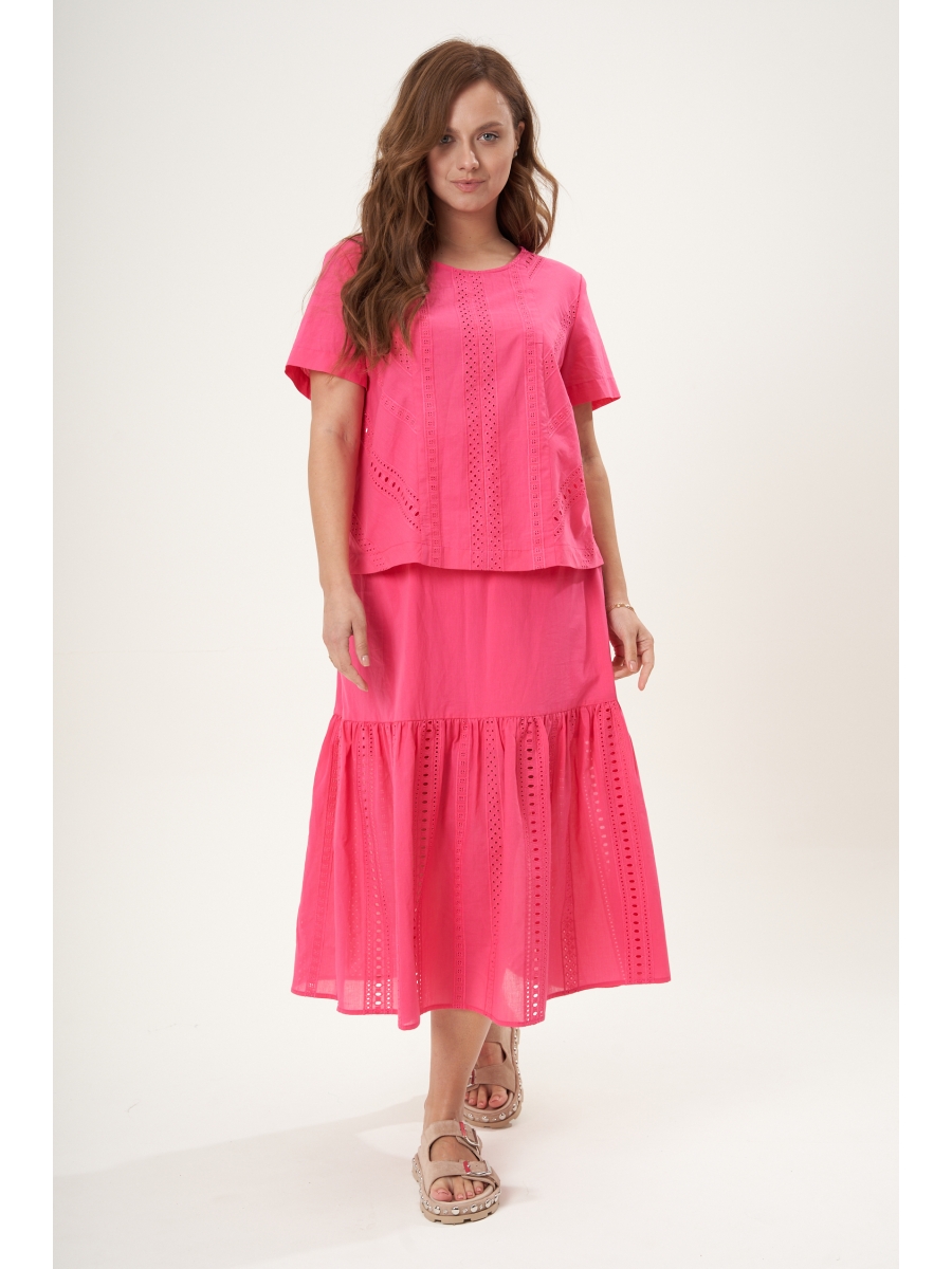 Юбка длины миди на притачном поясе с эластичной лентой и застёжкой в боковом шве на потайную тесьму - "молнию". Широкий волан юбки ажурный с лёгкой сборкой по линии притачивания. Верхняя часть юбки - из однотонной ткани, непрозрачная, на подкладке.