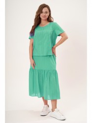Юбка длины миди на притачном поясе с эластичной лентой и застёжкой в боковом шве на потайную тесьму - "молнию". Широкий волан юбки ажурный с лёгкой сборкой по линии притачивания. Верхняя часть юбки - из однотонной ткани, непрозрачная, на подкладке.