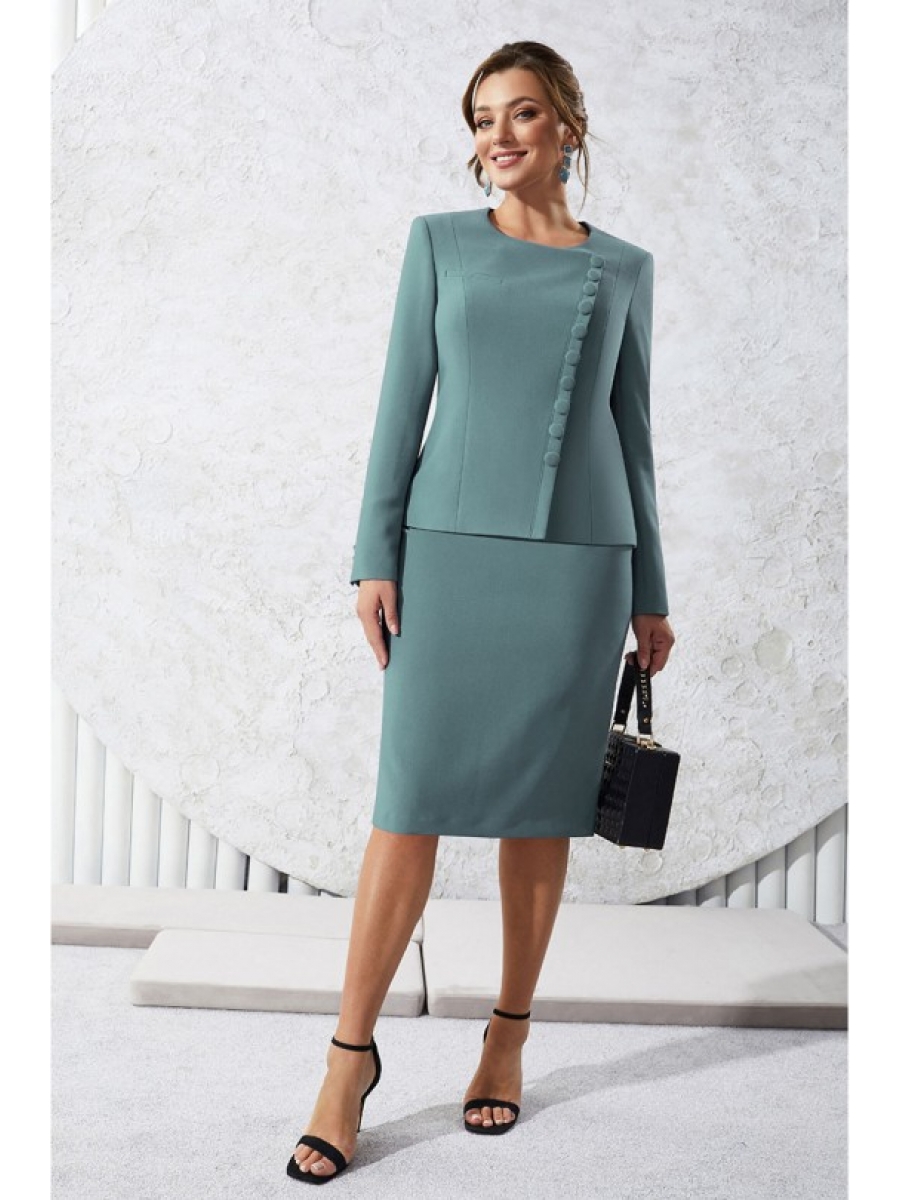 Жакет полуприлегающего силуэта с округлым вырезом и смещенной застежкой на пришивные кнопки (4 штуки), нижний подборт по горловине фиксируется на потайную пуговицу. Перед оформлен вертикальными рельефами от плеча с имитацией нагрудного кармана с листочкой и отрезной планкой (≈2-2,5см) с пришитыми наверх декоративными пуговицами, обтянутыми тканью костюма (10 штук). По планке выполнена узкая декоративная отстрочка. Спинка со средним швом и двумя рельефами от плеча. Рукава длинные двухшовные, втачные с имитацией обтачной шлицы (шлица не функциональная). Высота шлицы (обманки) с пробивными петлями и пришивными пуговицами ≈ 13,0 см.
