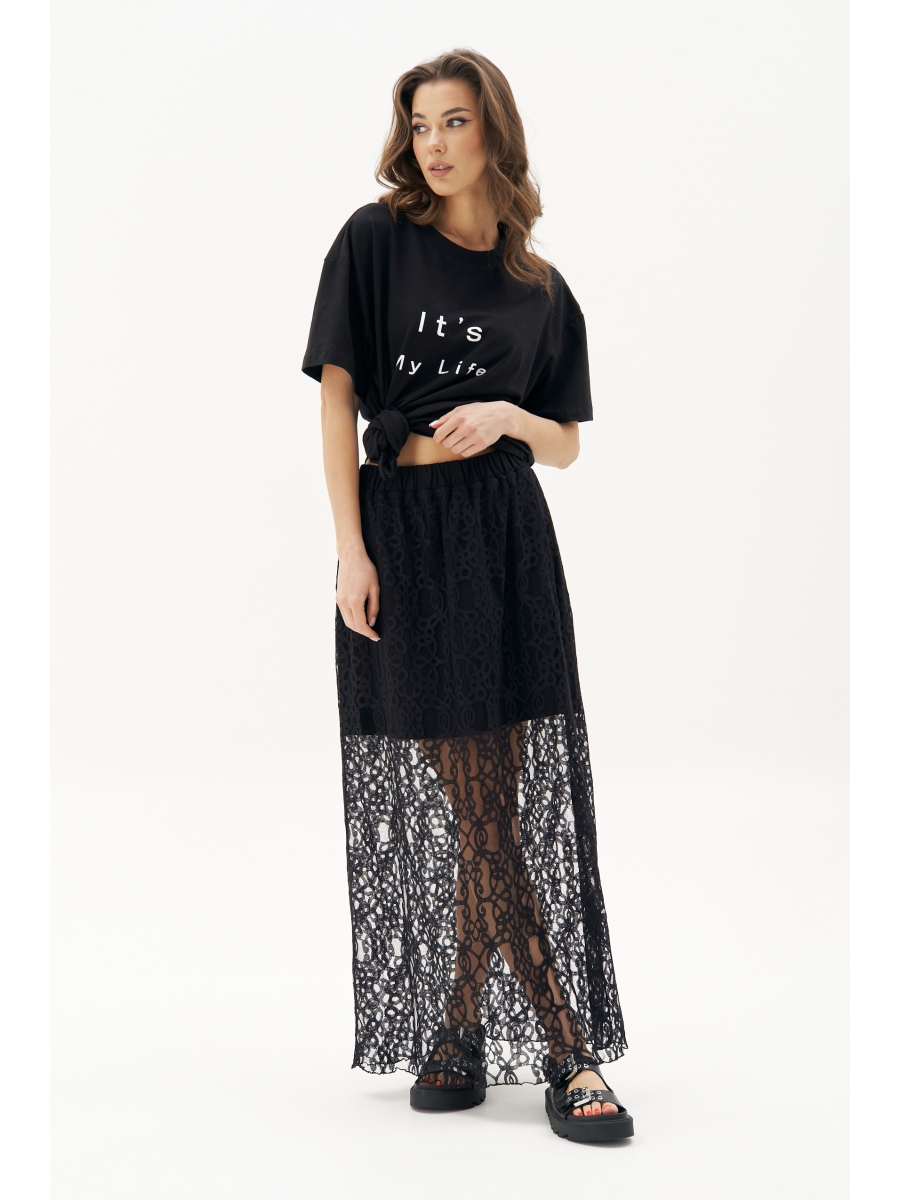 Свободная футболка и гипюровая длинная юбка с эластичной короткой юбкой внутри. Футболка широкая, удлинённая, с дизайнерским принтом и заниженной линией плеча.